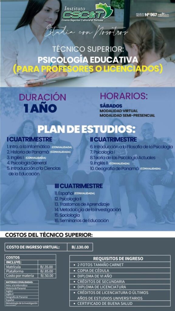 Desarrollo de habilidades clave: Estudiar el Técnico Superior en Psicología Educativa en la Fundación Institutos Panamá te brinda la oportunidad de adquirir habilidades esenciales para comprender y apoyar el desarrollo cognitivo, emocional y social de los estudiantes, lo que te convierte en un recurso valioso en el ámbito educativo.